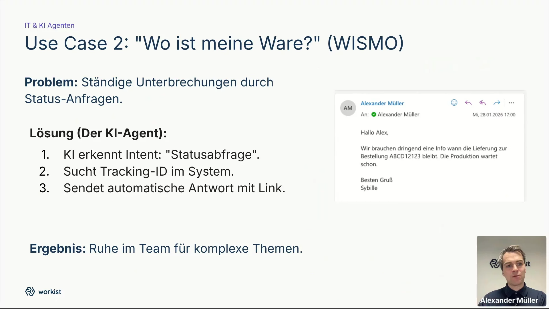 - Operational Excellence: Wie Sie durch den Einsatz von KI-Agenten und intelligenter Automatisierung Routineprozesse (z. B. Auftragserfassung) beschleunigen und Fehlerquoten minimieren, und so endlich wieder Zeit für das Wesentliche haben: Ihre Kunden.